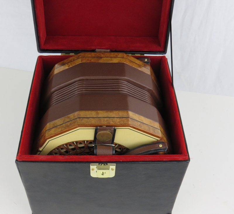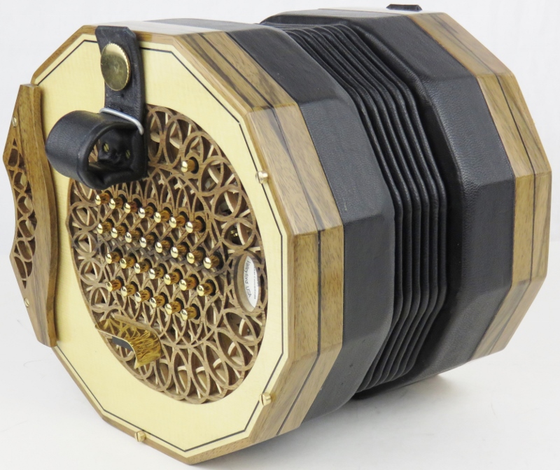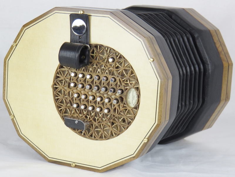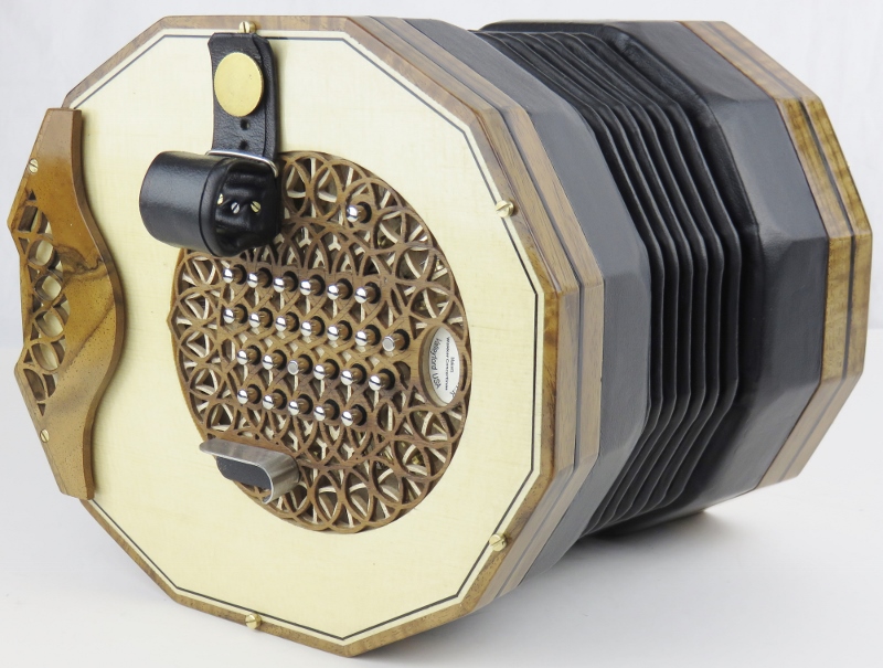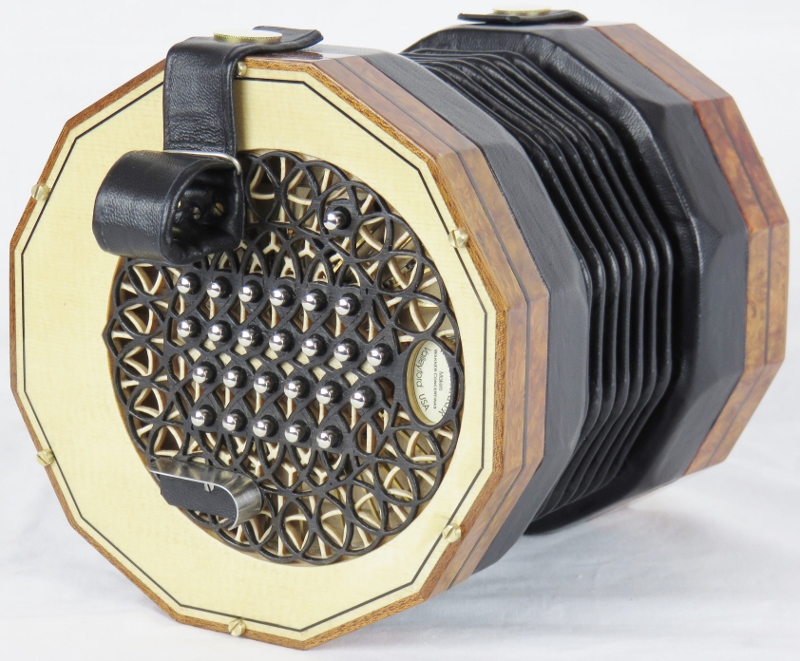 walnut rosette, ebony purfling, black bellows, nickel domed buttons,