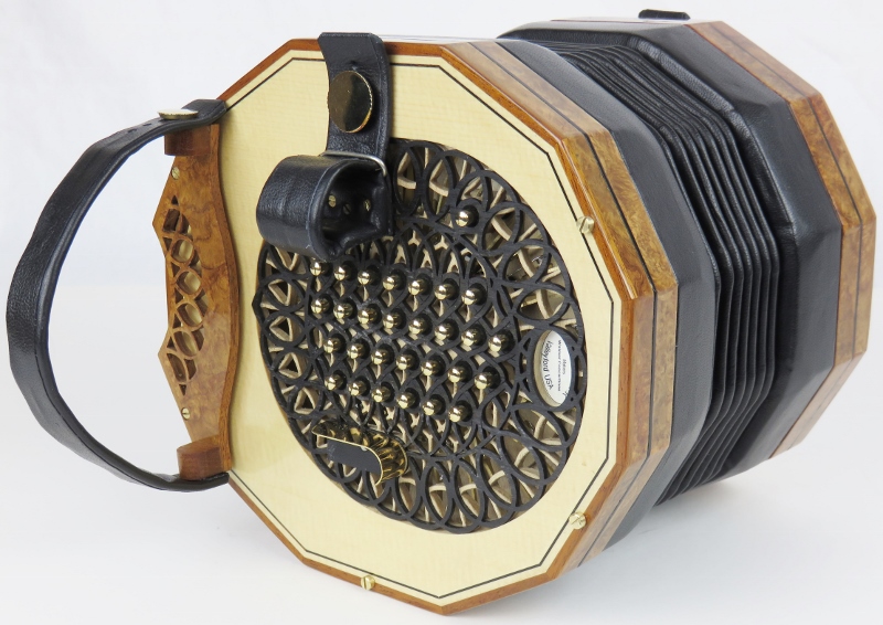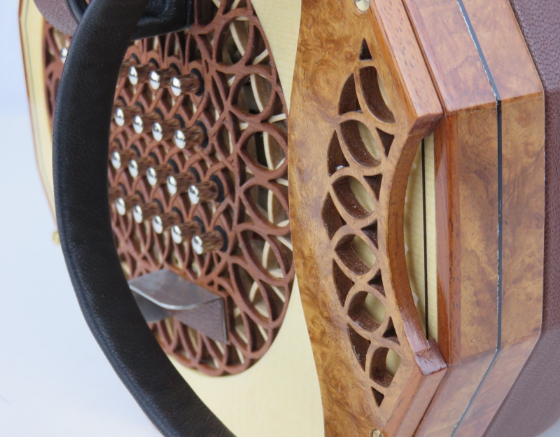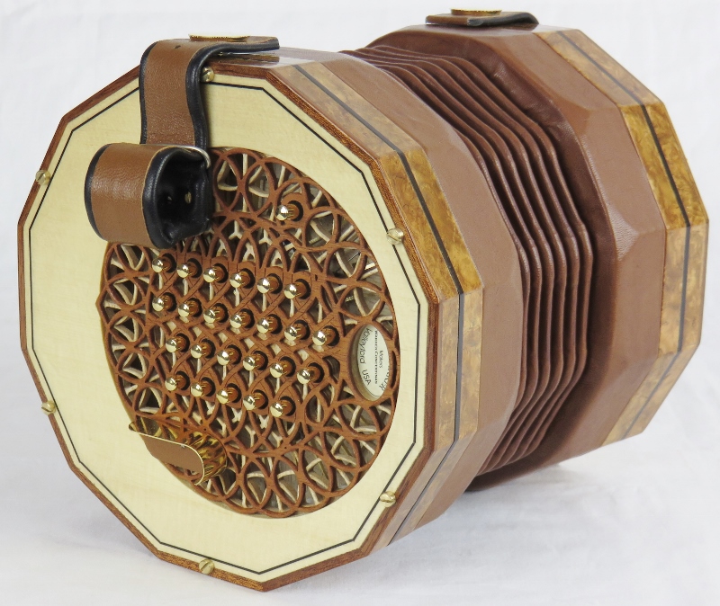 ebony purfling, light brown bellows, gold domed buttons,