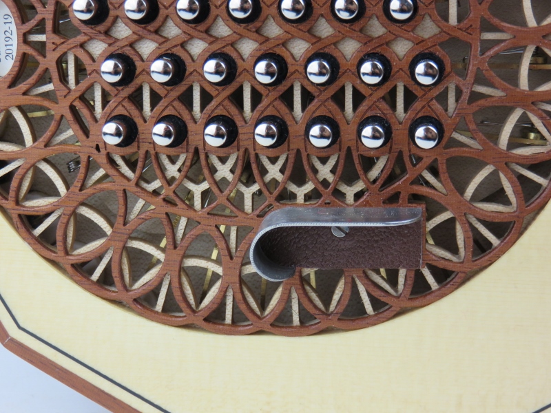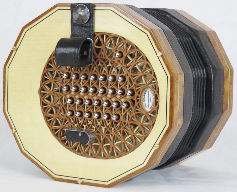 mahogany rosette, ebony purfling, black bellows, nickel domed buttons