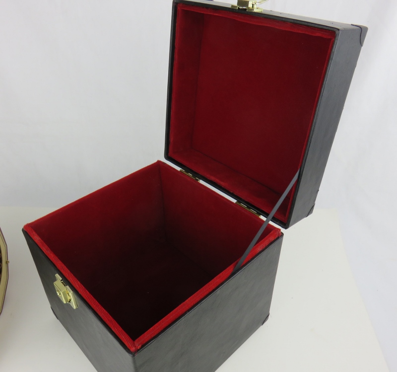 covered in black leather with a red velvet lining and brass hardware .